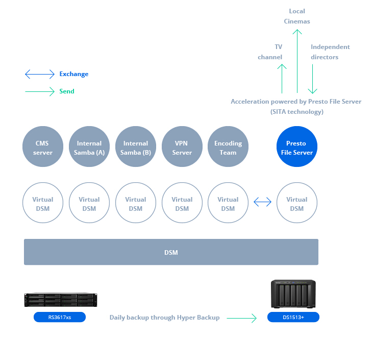 這一次,它購買了 RS3617xs,以 12 塊 10TB HDD 組成了 RAID 6,隨后針對設備上運行的 Virtual DSM 構建了 6 個完全隔離的虛擬實例,用于 所需要的不同用途,每個實例配備自己的 VLAN,以滿足 MPAA(美國電影協(xié)會)對不同設備的不同網(wǎng)絡可訪問性的安全規(guī)定。