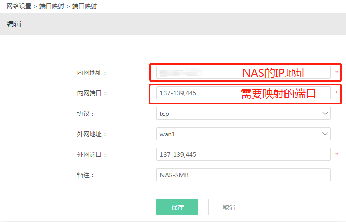 1、首先需要在路由器上做SMB相關(guān)端口的映射,將137-139和445端口映射到外網(wǎng)。