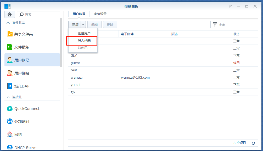 在用戶賬號列表中選擇新增右邊的倒三角展開下拉選項,選擇導(dǎo)入列表。