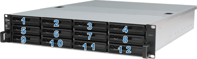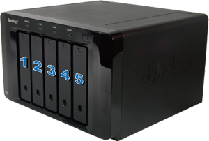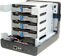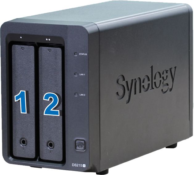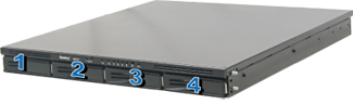 針對 2 顆或以上硬盤機種的 Synology NAS,硬盤位置的排序由左至右,或是由上至下。 要找到實際相應硬盤,請參照下圖所示的編號。